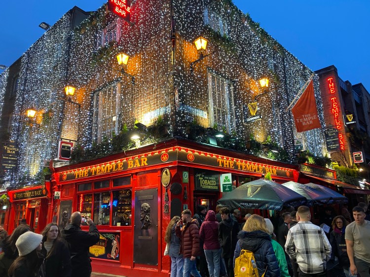 After our early dinner, we headed back to the hotel to check in and have a little down time. We try to stay awake as long as possible on the first day; we’ve found over the years that it helps us acclimate to a new time zone quickly. Around 8pm, we were both feeling tired, so we headed out for another walk to stay awake for just a bit longer. We walked to the Temple Bar area and it was so worth it. This area was hopping and lit up with twinkle lights. So fun!