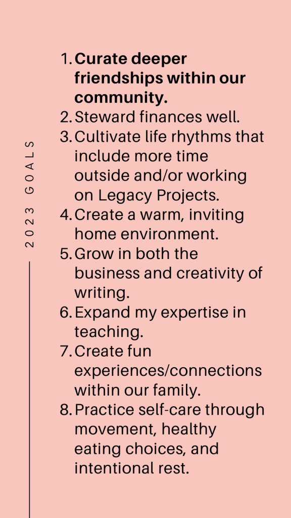 Deep friendships are rarely formed in the space of a day. Time, shared experiences, and trust are all needed to create deeper relationships. The action steps I’m listing today are daily, weekly, and monthly actions I plan to implement over the first quarter of the year, helping me implement rhythms and routines that create an atmosphere in my life where relationships can flourish.