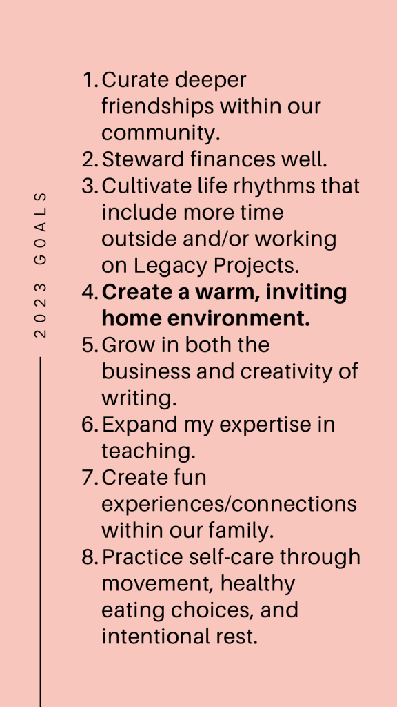 A next step that I hope to implement during the second quarter (remember, this is the long game for these yearly goals) is to complete a deep Spring clean in April and then implement a “keep it clean” weekly plan to help with the big stuff.